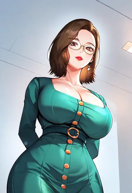 (( lora:do_jeong-hwa:1 , do_jeong-hwa, 纤细腰身,宽臀,完美肌肤,迷人棕褐色眼睛,清澈双眼,明亮瞳孔,美丽双眼,秀美棕发,短发,巨大蓬松胸部,自然美,超凡美女,迷人女性,超级性感女性,欲望躯体,性感且诱人露骨身材,性感体态,丰腴身体,性感美人,无穿孔,无耳洞,眼镜,金色镜框)),