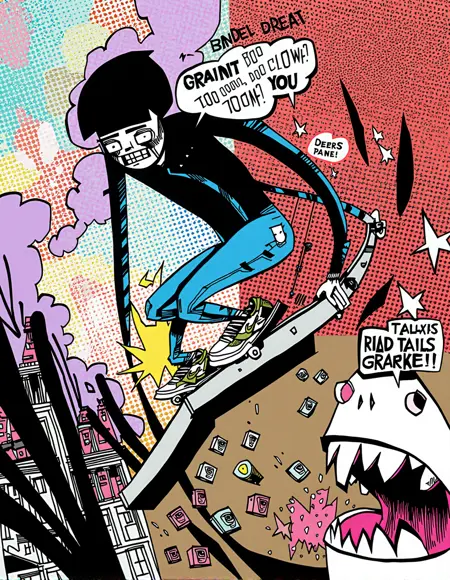 매푸드의 일러스트는 강렬하고 표현력이 풍부한 캐릭터, 과장된 비율, 그리고 움직임의 감각으로 특징지어진다. 브러시 워크, 잉크 방울, 혼합 매체와 같은 다양한 기법을 사용해 그림에 텍스처와 깊이를 더한다.