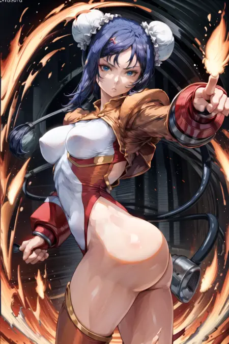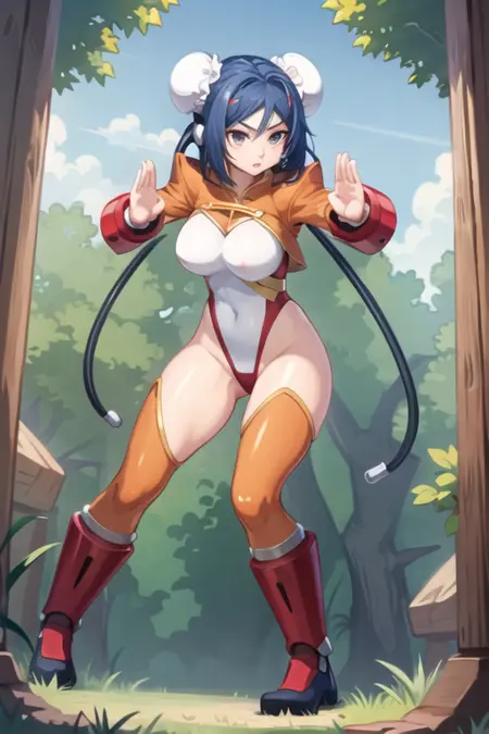 mei-fang bun cover cable, ass, blue hair, breasts, bun cover, cropped jakect, shrug (clothing), orange thighhighs, hairclip, android