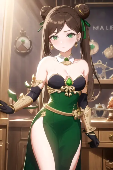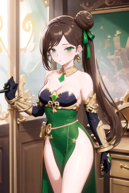 | 학습된 단어 | JadeEversoul, 1girl, solo, long hair, brown hair, hair ornament, elbow gloves, green dress, cleavage, bare shoulders, jewelry, medium breasts, green eyes, hair ribbon, earrings, choker, side ponytail, strapless, detached collar, ((single hair bun)), side slit, green ribbon, single gauntlet복사됨! |