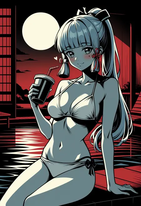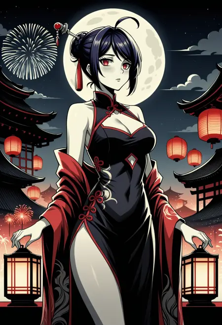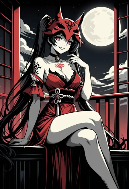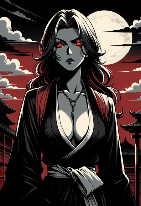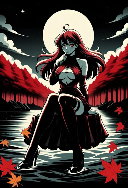 希望の効果を得るために、ヘルパーとして**「high contrast, shadow, red theme, limited palette, full moon」**を使用してください。