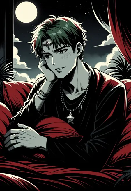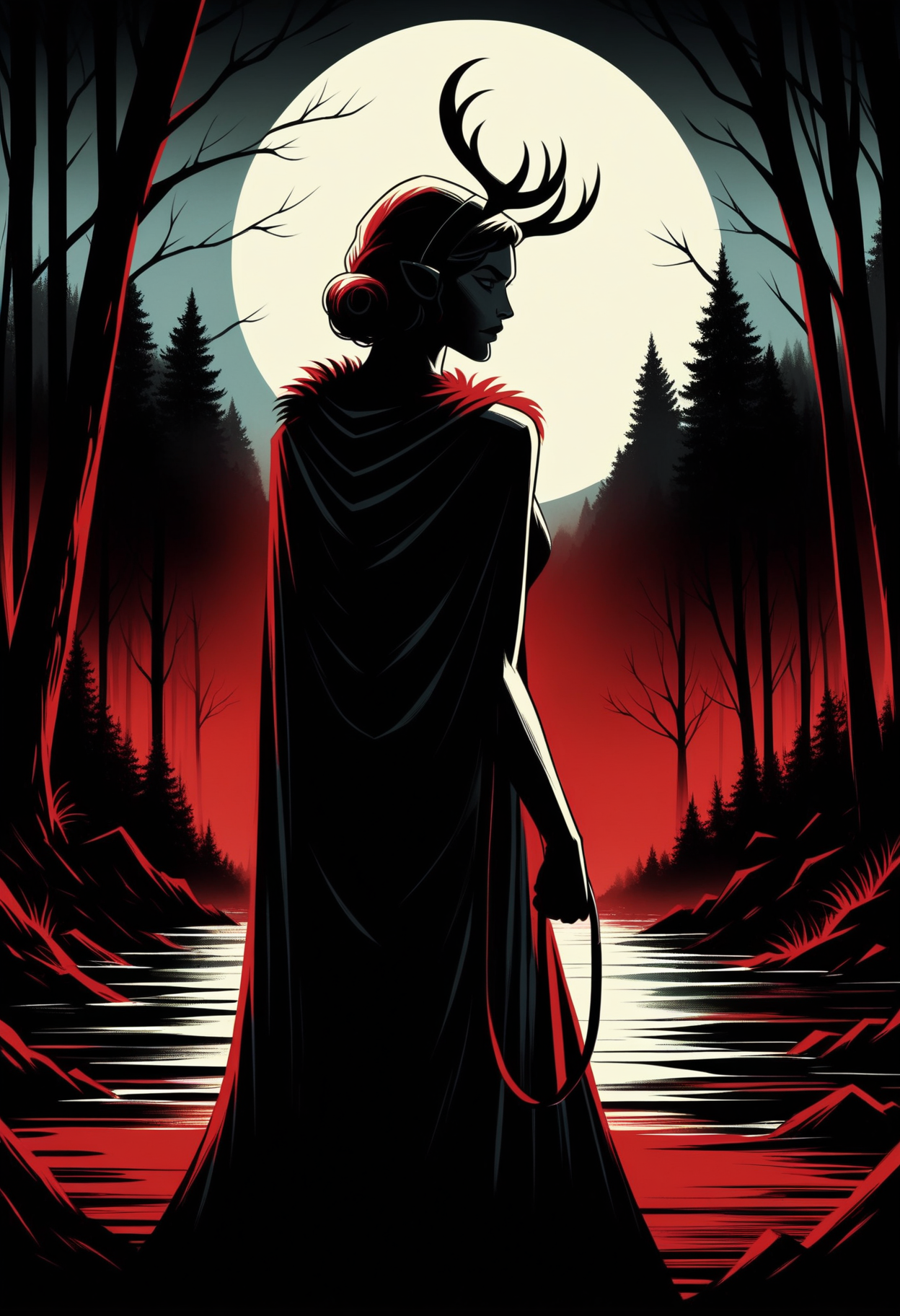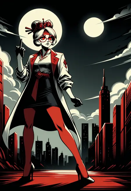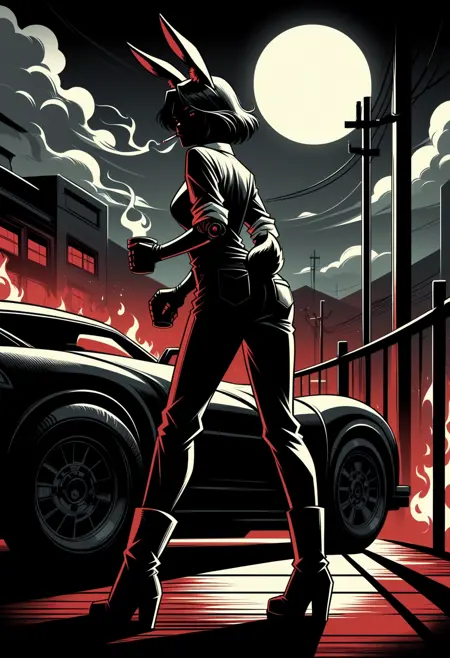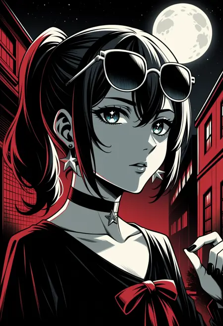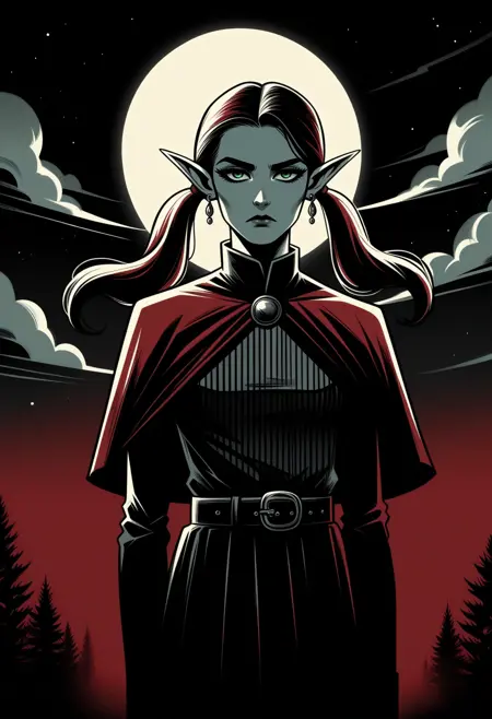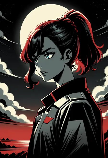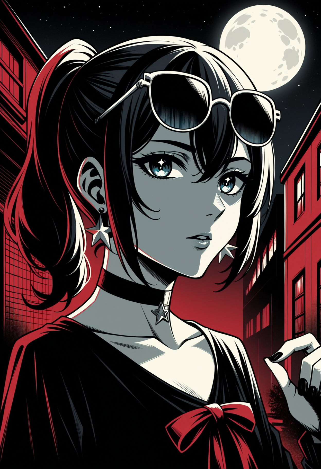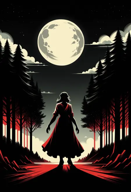 「Lunar Noir」は、フィルム noir の鋭いコントラストと神秘性を、不気味な月明かりの背景と融合させ、鮮やかな赤色のテーマで強調した、暗く雰囲気のあるアートスタイルです。これにより、影に包まれた人物やゴシック建築、そして不気味でほぼ超自然的な雰囲気がより一層際立ちます。
