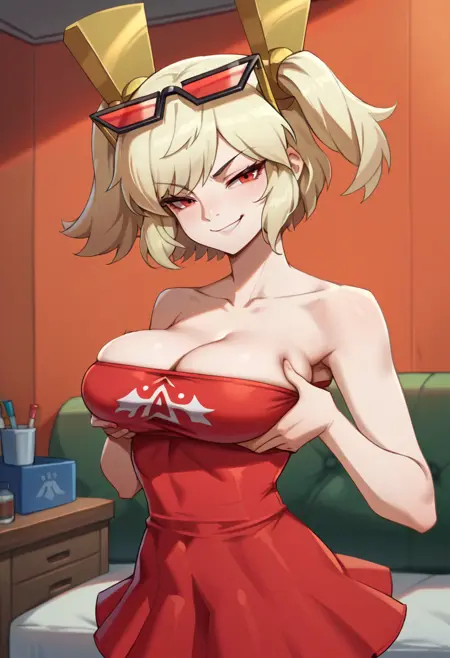 BurniceWhite, short hair, short twintails, hair ornament, sunglasses, eyewear on head, red halterneck, black tube top, crop top, cleavage, midriff, black jacket, fingerless gloves, spiked belt, black skirt, red thigh straps, black thighhighs