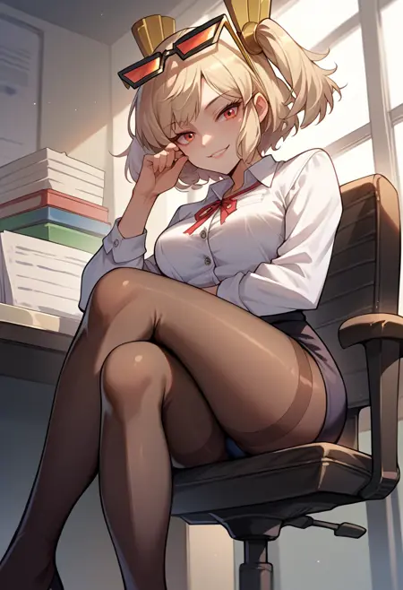 BurniceWhite, short hair, short twintails, hair ornament, sunglasses, eyewear on head