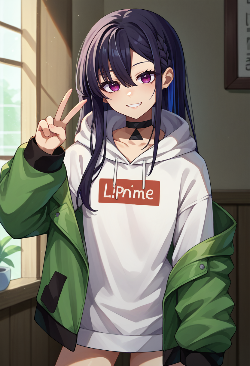 IchinoseDefault, long hair, braid, multicolored hair, black choker, white hoodie, clothes writing, no pants, green jacket, off shoulder