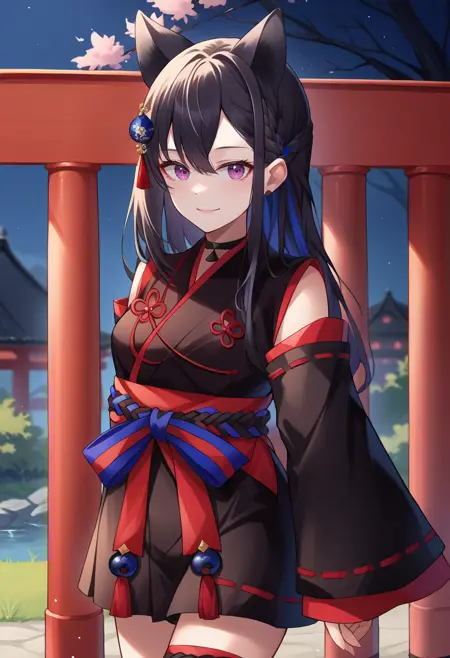 IchinoseKimono, long hair, braid, multicolored hair, animal ears, tassel hair ornament, black choker, black kimono, detached sleeves, short kimono, red sash, rope belt, thigh strap, ribbon trim, black thighhighs