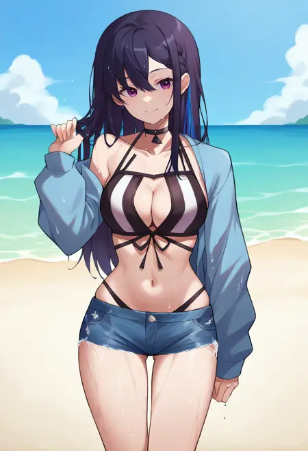 IchinoseBikini, long hair, braid, multicolored hair, black choker, black bikini, cleavage cutout, vertical-striped bikini, blue cardigan, denim shorts
