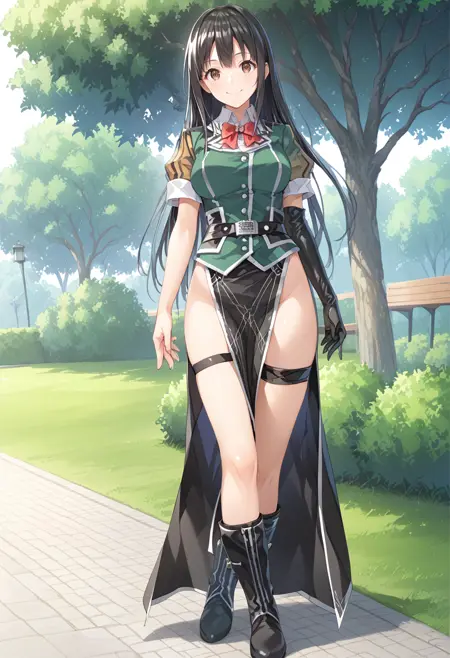 默认服装:chikumadefkc,绿色连衣裙,铅笔裙,短袖,红色蝴蝶结,领结,单只手套,肘部手套,黑色手套,黑色过膝袜,单只过膝袜,大腿绑带,黑色靴子