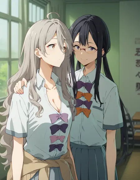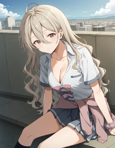 학교 유니폼, 흰 셔츠, 칼라 셔츠, 반팔, 부러진 골반선, 가슴, 분홍색 리본넥타이, 보라색 리본넥타이, 느슨한 리본넥타이, (손목 스쿠니:0.8), 허리에 둘러싼 스웨터, 회색 플리츠 치마, 파란 무릎까지 긴 양말, 흰 신발