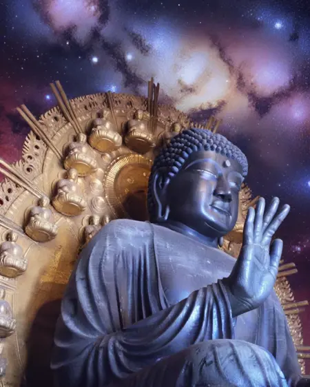 비로자나불은 모든 존재와 현상에 비추고 포용하는 빛을 상징한다. 그는 보편적 진리와 전체성을 구현한 존재로, 모든 존재에게 균등하게 빛을 발산하는 모습으로 묘사된다. 종종 거대한 동상으로 나타나며, 광대한 세계를 감시하고 인도하는 상징적 존재로 여겨진다. 비로자나불은 무한한 지혜와 자비를 지니고 있으며, 모든 존재를 이해하고 공감하며 인도한다.人們은 그를 이러한 덕목의 상징으로 숭배한다.