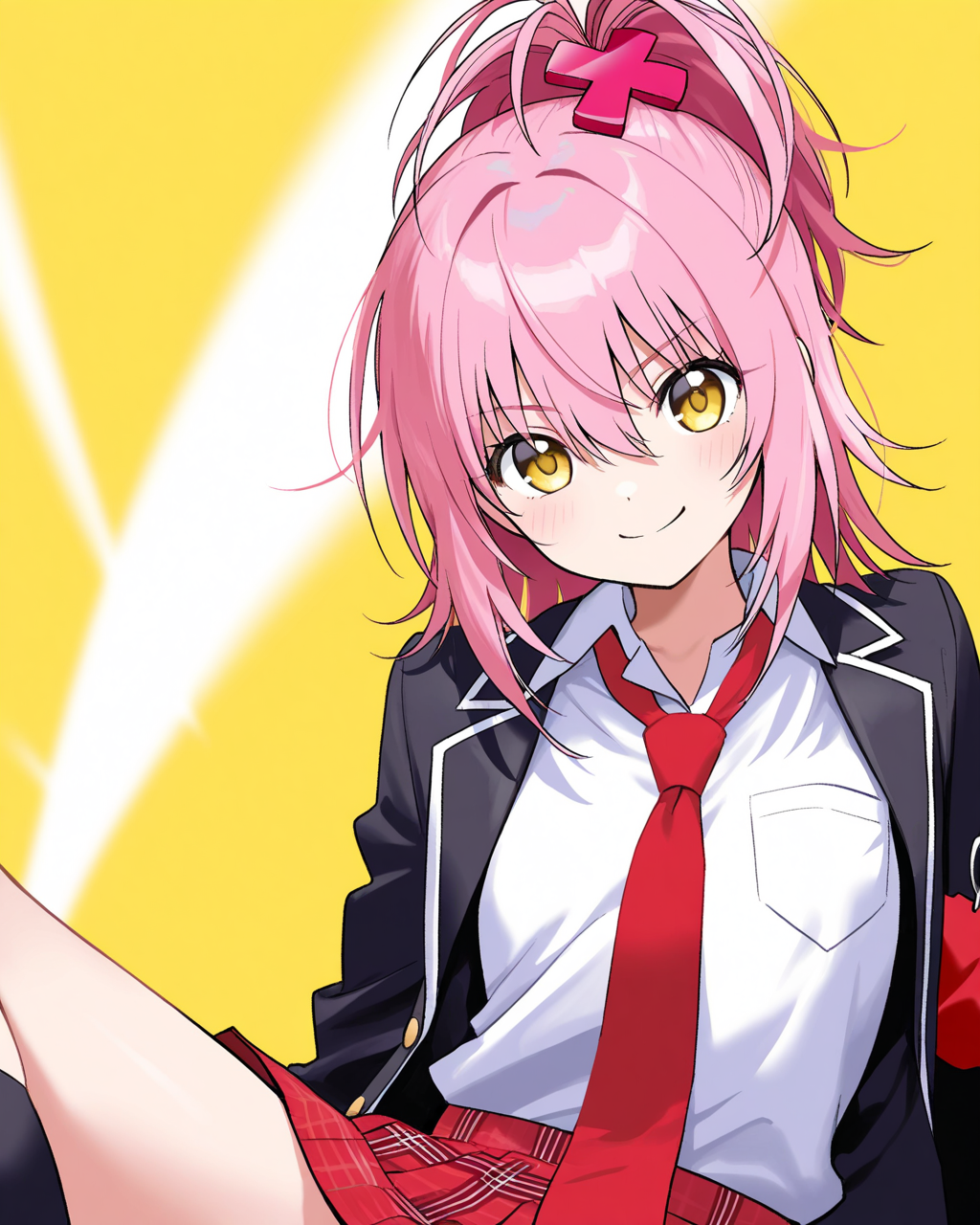 Hinamori Amu : Hinamori Amu, 1girl, solo, pink hair, yellow eyes,x hair ornament,bangs,hair between eyes,short hair, ponytail,armband, red necktie, white shirt, plaid skirt, pleated skirt,red skirt, socks, school uniform, open clothes, black jacket, open jacket,
