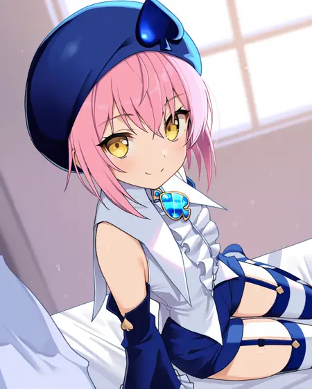 amulet spade : amulet spade, 1girl, solo, yellow eyes,pink hair,hat, short hair, garter straps, blue shorts, detached sleeves, striped thighhighs, blue headwear,frills,shirt, white shirt, bow,Light blue beret,