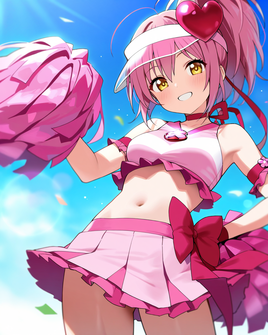 amulet heart : amulet heart, 1girl, solo, pink hair,yellow eyes,hair ornament, frills, ponytail, armband,pink skirt,visor cap,skirt, pom pom \(cheerleading\), magical girl, navel,cheerleader, ribbon,