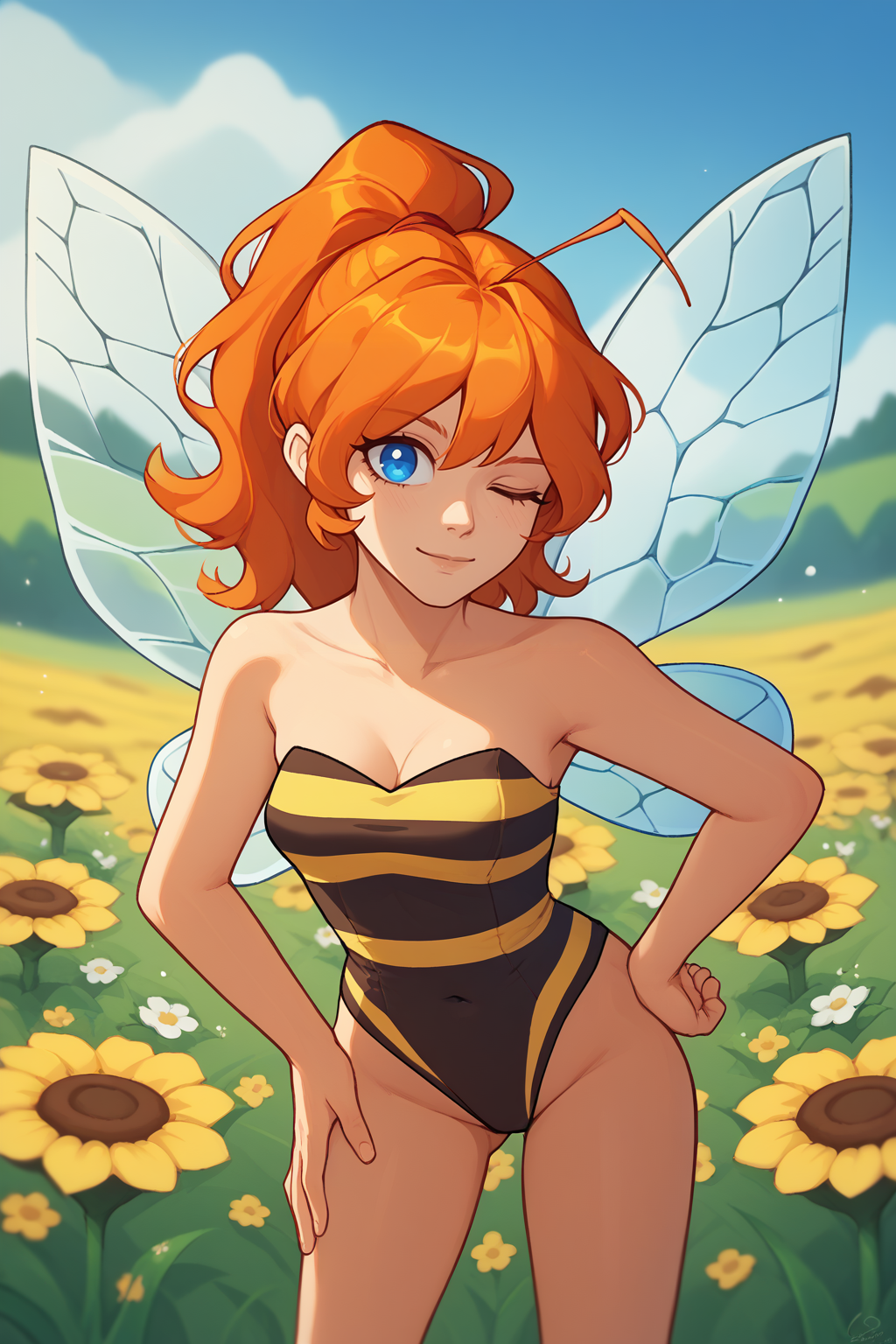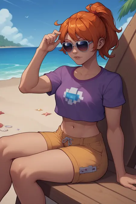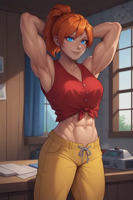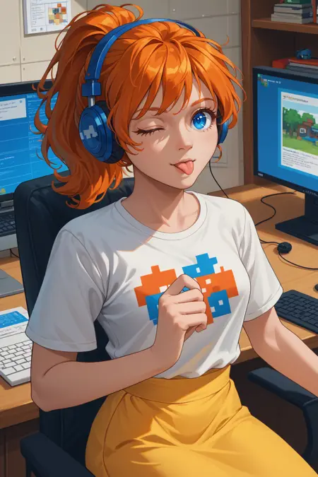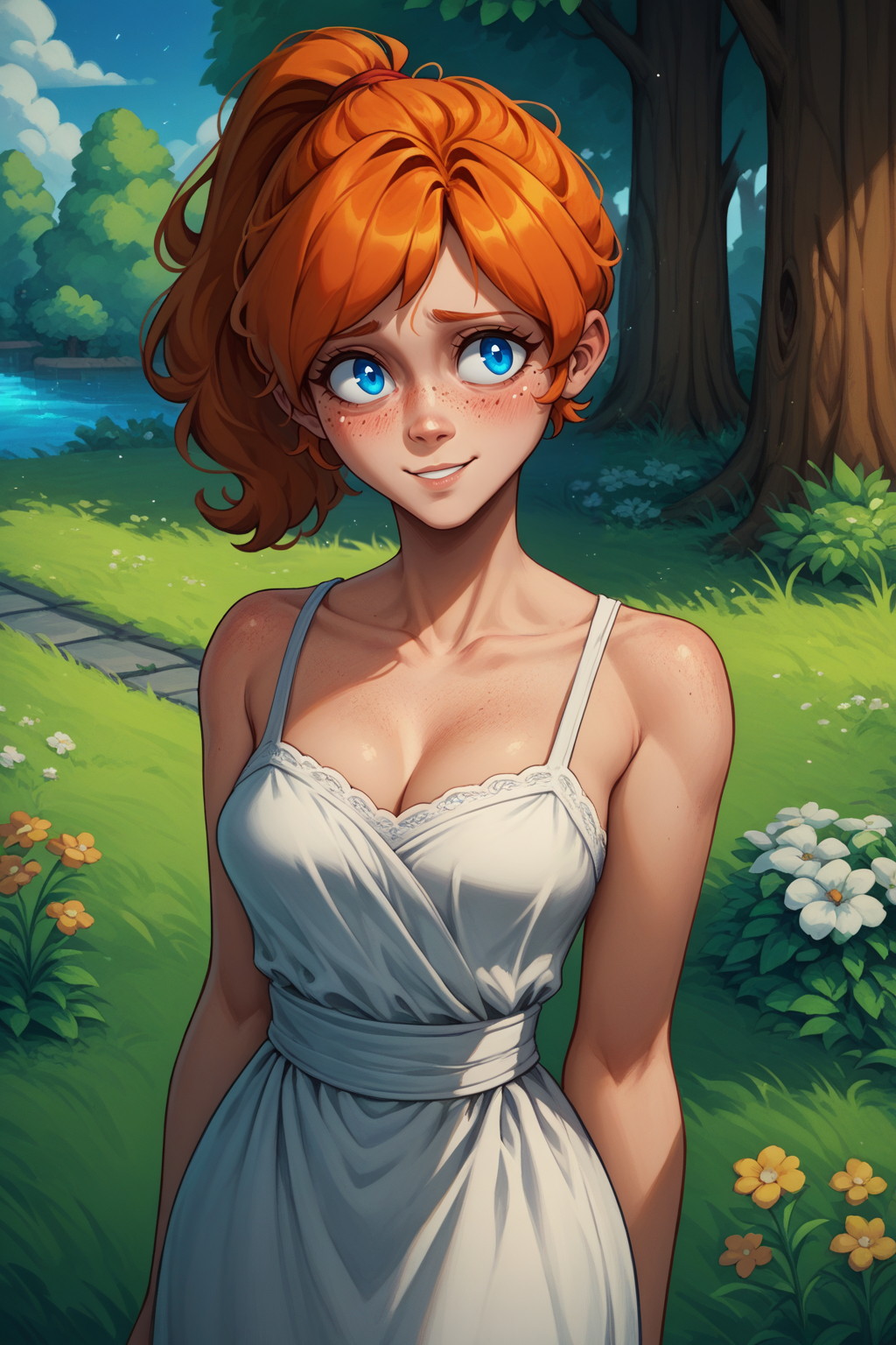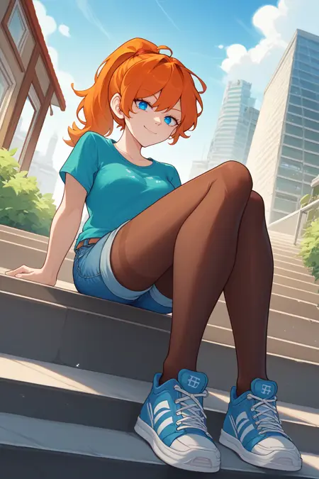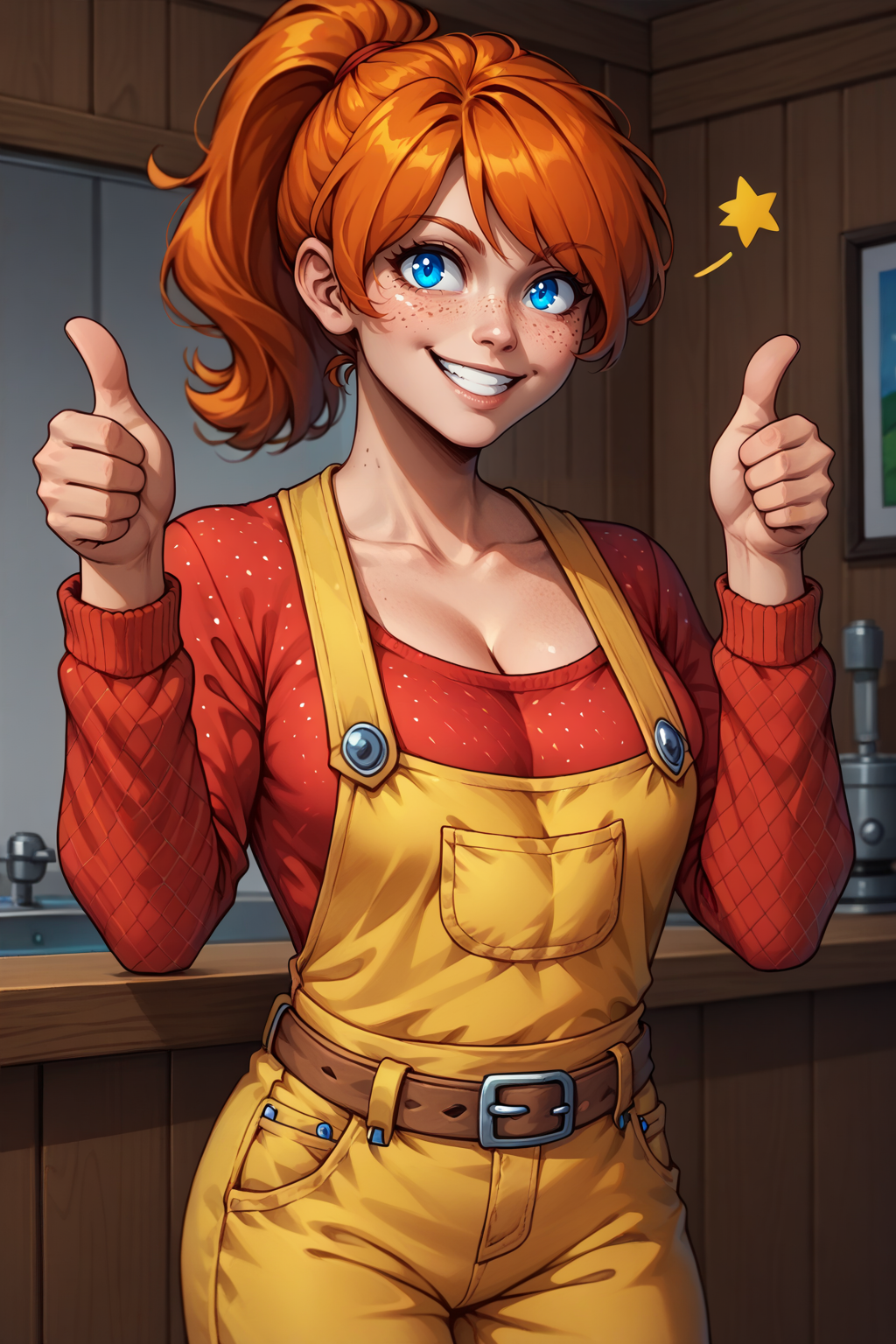 Main Prompt: NSMechanicTerraria, blue eyes, orange hair, ponytail, medium hair, freckles,