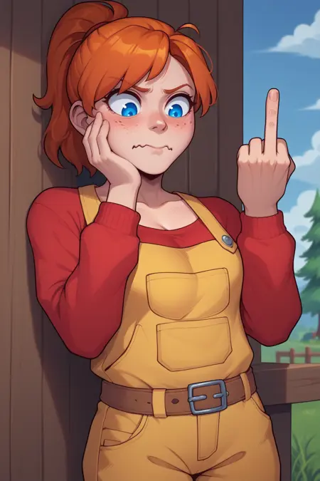 For her cute yellow overalls, please use: NSMechanicTerraria, blue eyes, orange hair, ponytail, medium hair, freckles, red sweater, yellow overalls, long sleeves, brown belt,