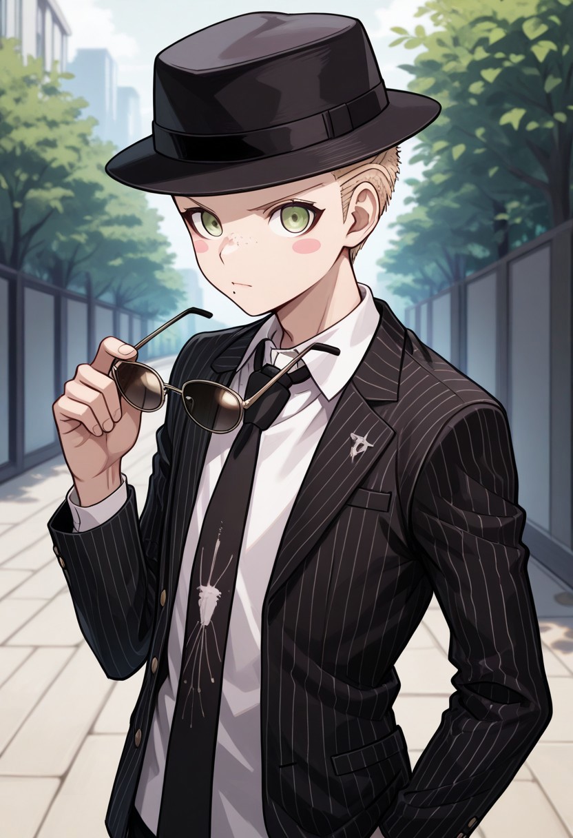 Fuyuhiko, 1boy, male focus, solo, green eyes, blonde hair, very short hair, blush stickers, freckles, mole, mole under mouth, formal, shirt, white shirt, collared shirt, necktie, black necktie, jacket, black jacket, open jacket, open clothes, striped jacket, stripes, vertical stripes, pants, black pants, striped pants, shoes, black footwear,