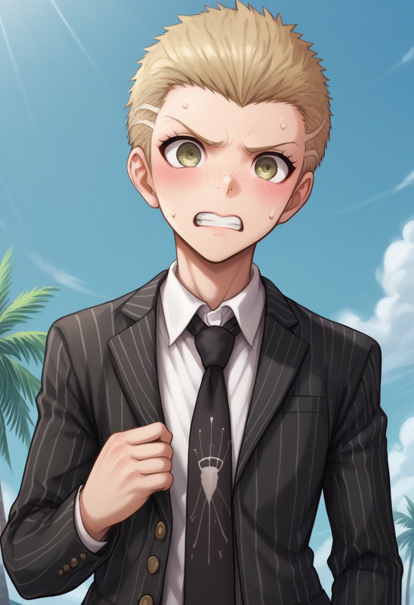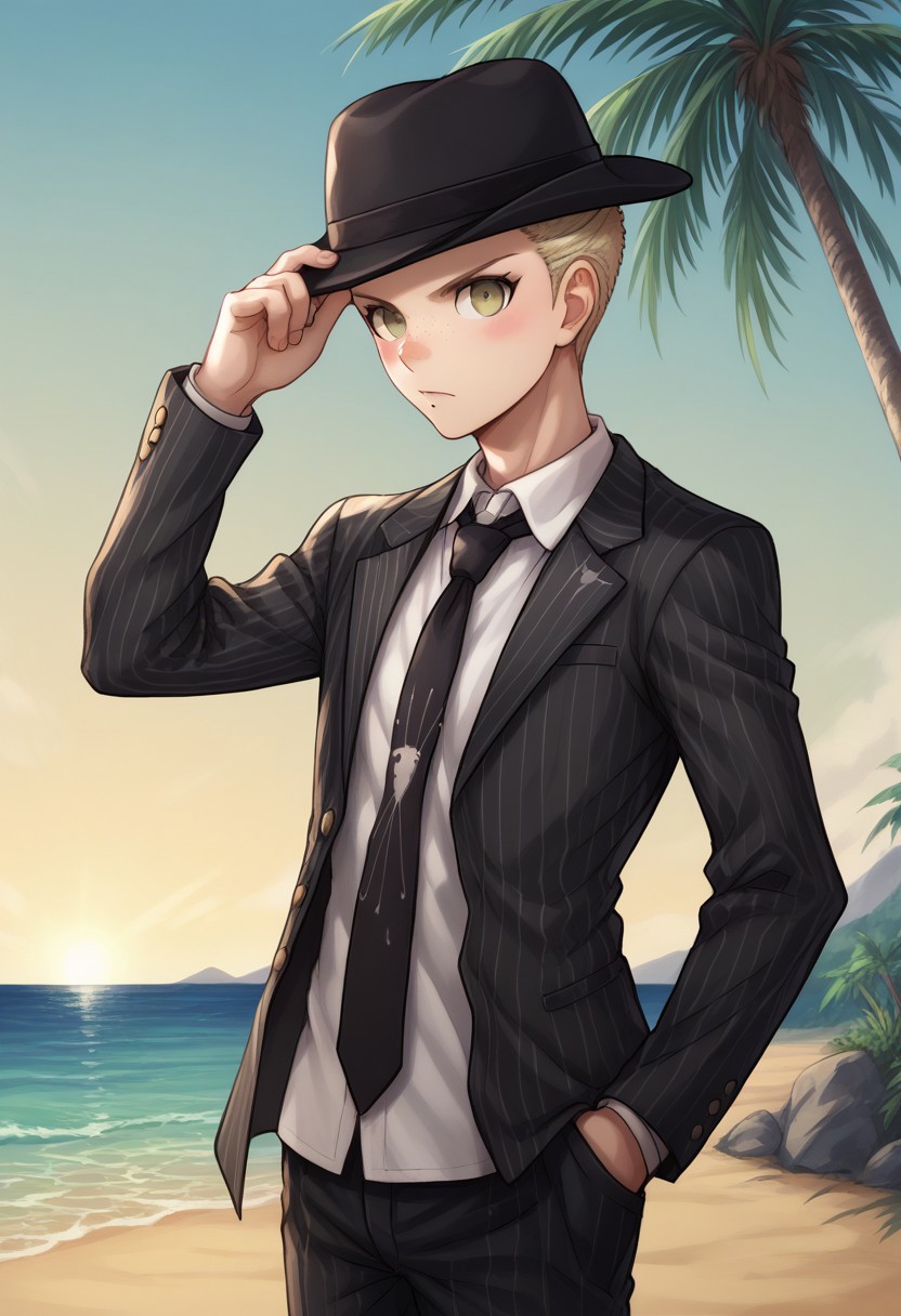 Fuyuhiko,1个男孩,男性焦点,solo,绿色眼睛,金色头发,极短发,腮红贴纸,雀斑,痣,嘴下有痣,正式,衬衫,白衬衫,有领衬衫,领带,黑色领带,夹克,黑色夹克,敞开的夹克,敞开的衣物,条纹夹克,条纹,竖条纹,裤子,黑裤子,条纹裤子,鞋子,黑色鞋履,