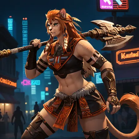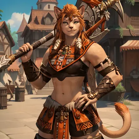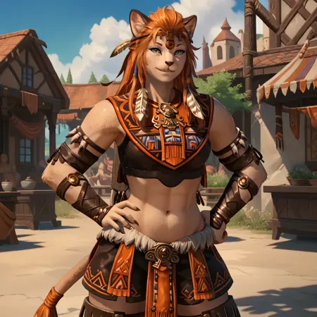 Trigger Word & Apperance: wuklamat, body fur, animal nose, green eyes, long orange hair, claws, long fingernails, black fingernails, tail