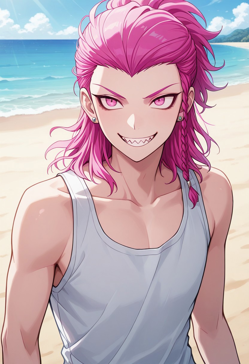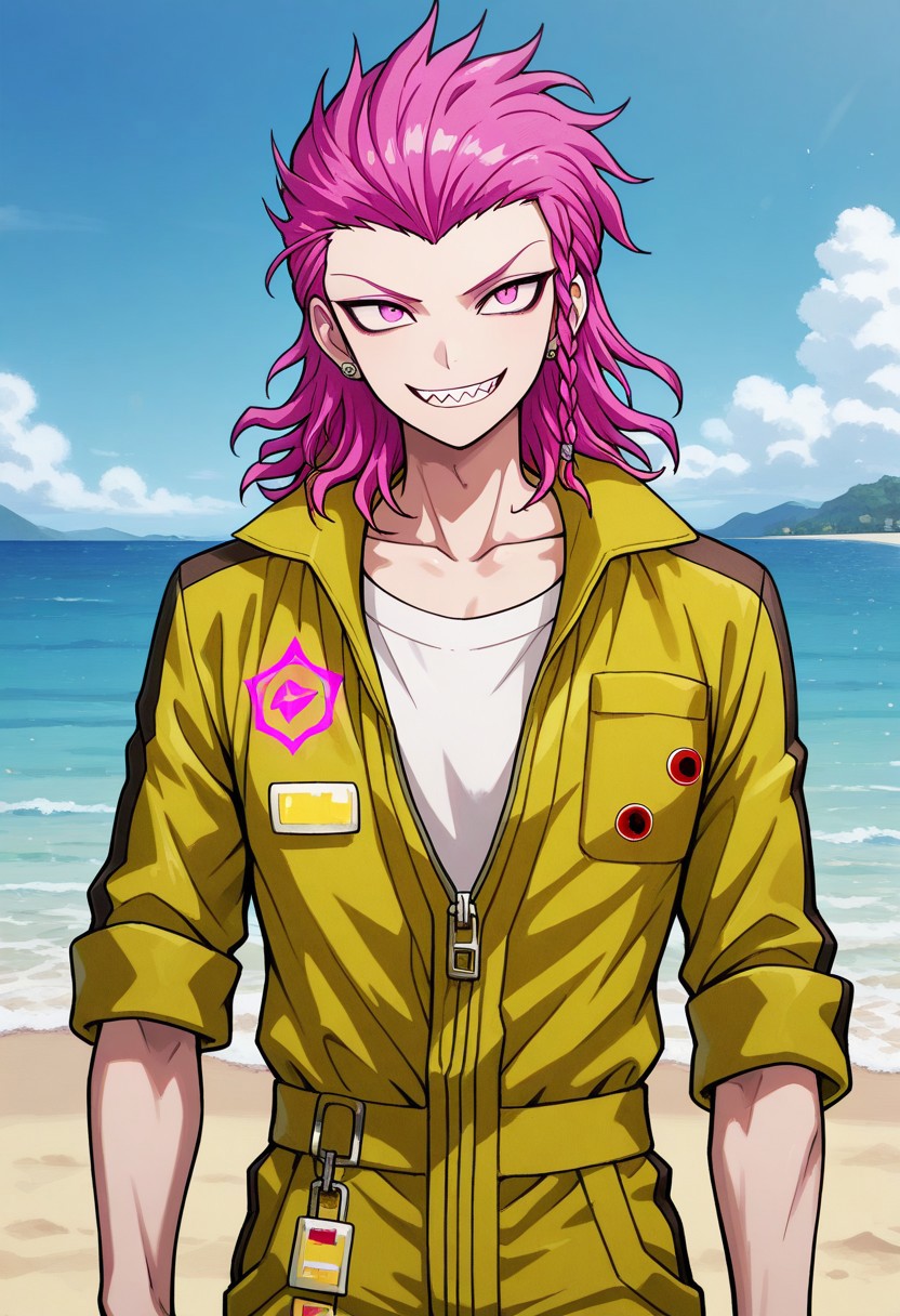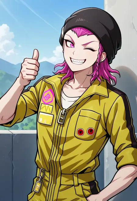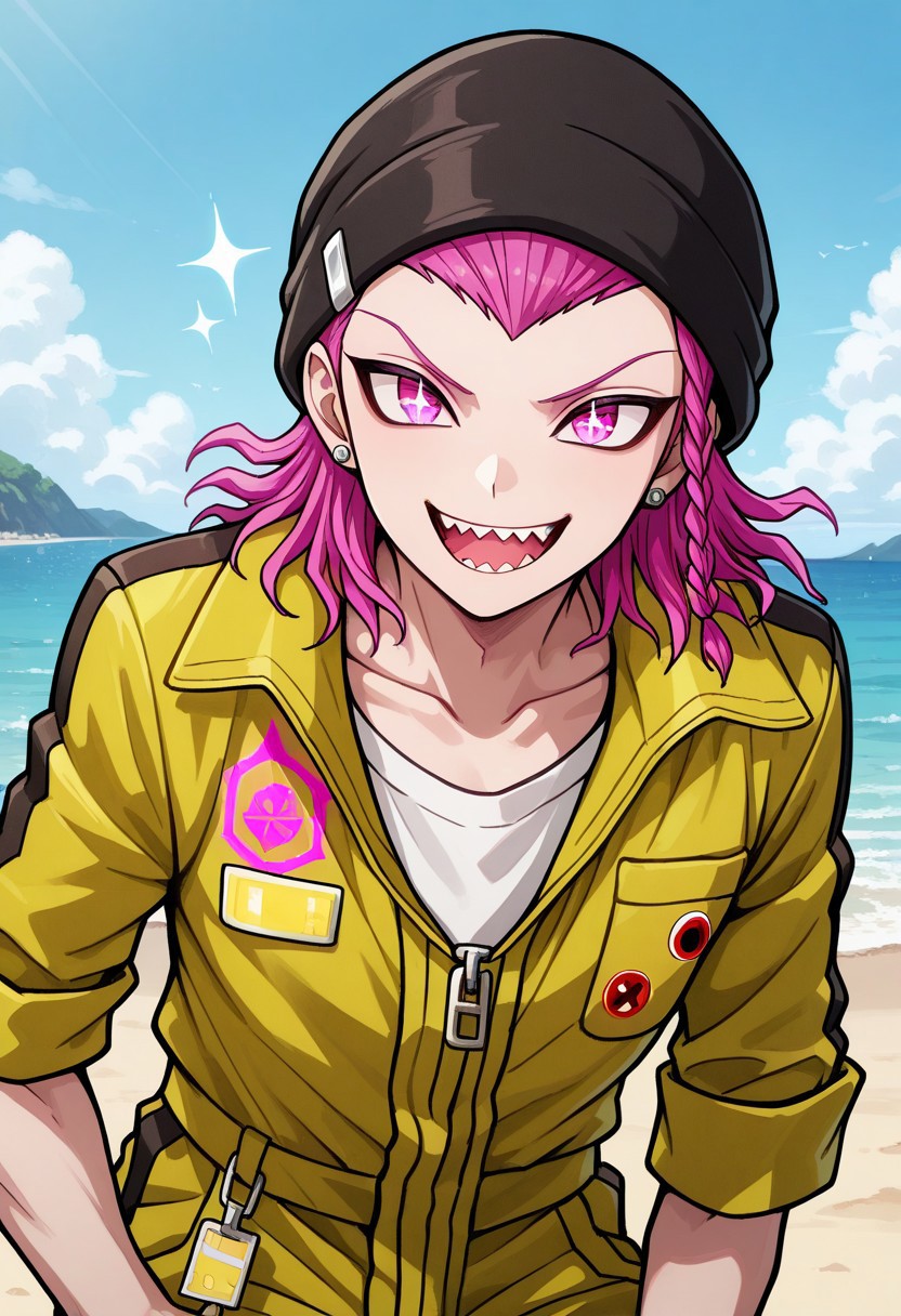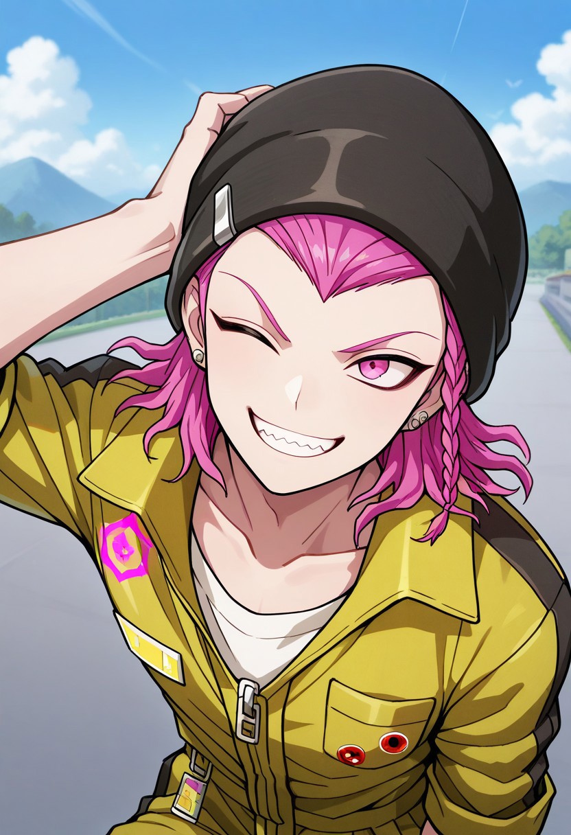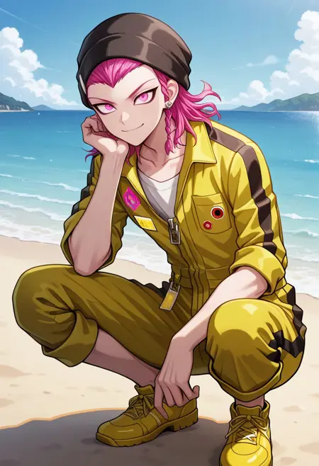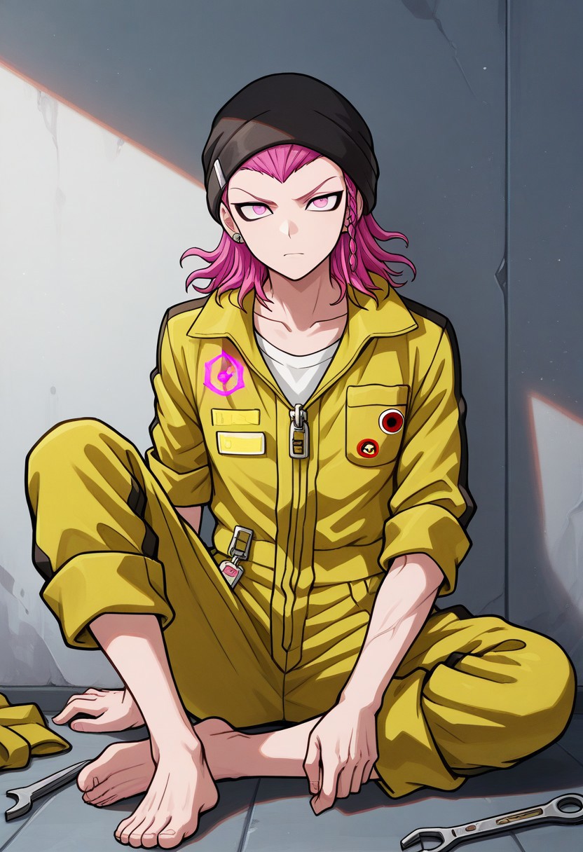 kazuichi, 1boy, male focus, solo, pink eyes, pink hair, medium hair, braid, side braid, bangs, hat, black hat, beanie, jewelry, earrings, collarbone, jumpsuit, yellow jumpsuit, shirt, white shirt, sleeves rolled up, pants rolled up, zipper pull tab, shoes, yellow footwear,
