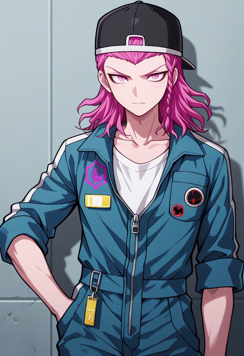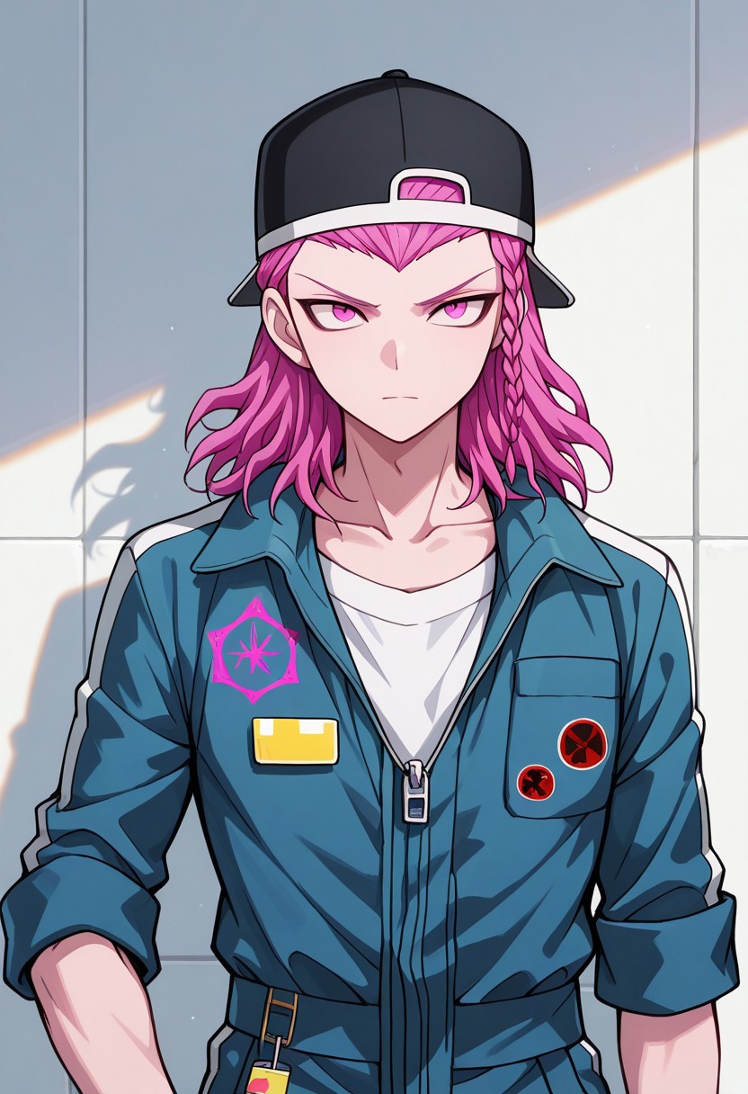 kazuichi, 1boy, male focus, solo, pink eyes, pink hair, medium hair, braid, side braid, bangs, hat, black hat, baseball cap, backwards hat, collarbone, jumpsuit, blue jumpsuit, shirt, white shirt, sleeves rolled up, wristand, pants rolled up, zipper pull tab, shoes, white footwear,