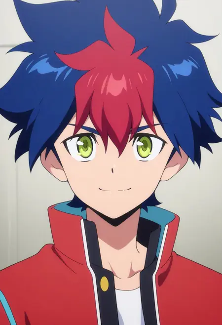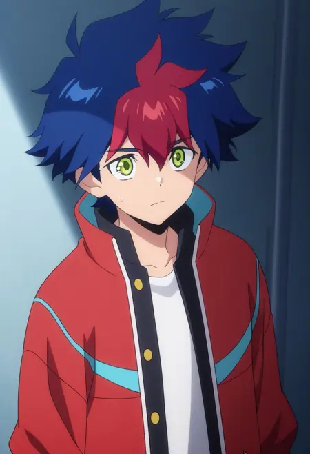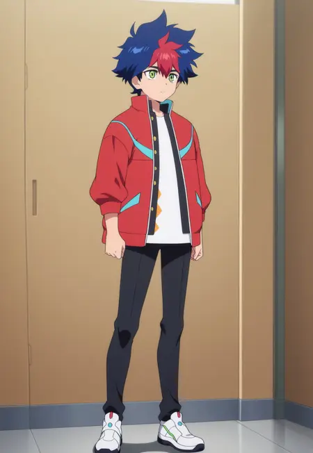 텐류, 1남자, 남성 중심, 혼자, 파란 머리, 녹색 눈, 다색 머리, 재킷, 빨간 머리, 빨간 재킷, 신발, 이색 머리, 셔츠, 스니커즈, 스파이크 머리, 바지,