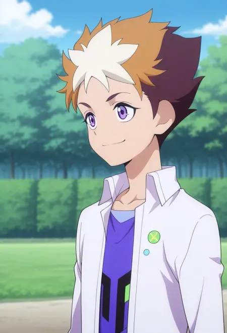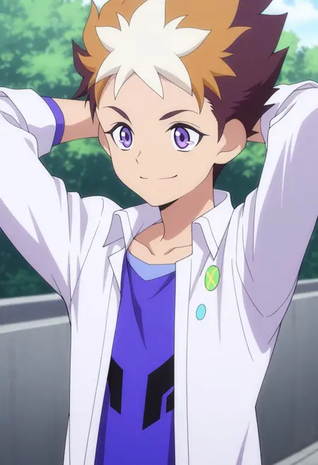 SubaruMakabe, 1boy, male focus, solo, purple eyes, multicolored hair, brown hair, white hair, collarbone, shirt, purple shirt, white shirt, collared shirt, open shirt, sleeves rolled up, pants, black pants, belt chain, shoes,