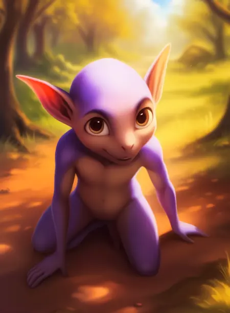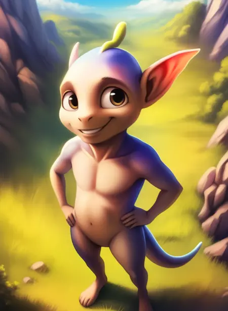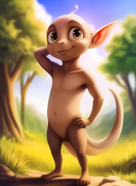 CadDaiMilAlien, alien, tail, brown skin, elven ears, blue eyes, chibi,
