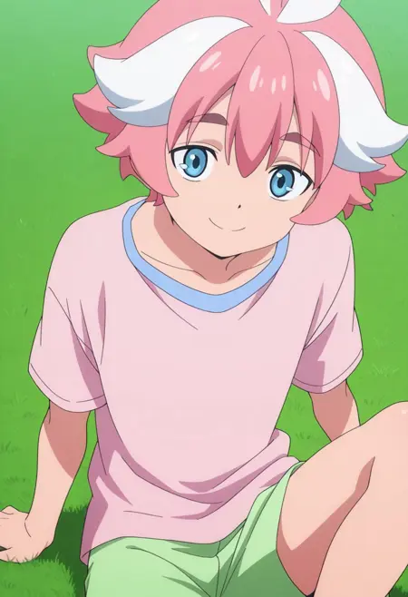 ItsukiMitsutagawa, 1boy, male focus, solo, blue eyes, multicolored hair, pink hair, white hair, shirt, white shirt, collared shirt, ribbon, neck ribbon, green ribbon, jacket, pink jacket, hood, green hood, open jacket, pants, black pants, socks, green socks, shoes, brown footwear,