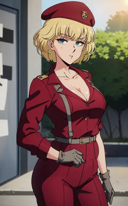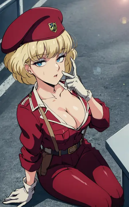 cleavage, hat, beret, grey gloves, military uniform, suspenders, belt, red pants, red headwear, red jacket,