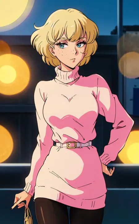 1girl, blonde hair, short hair, freckles, makeup, sweater, blue eyes, eyeshadow, bangs, breasts, medium breasts,