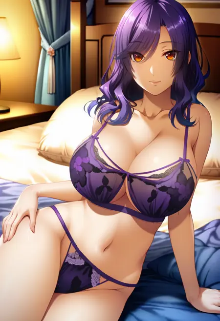 パープルの髪、茶色の目、成熟した女性、長い髪