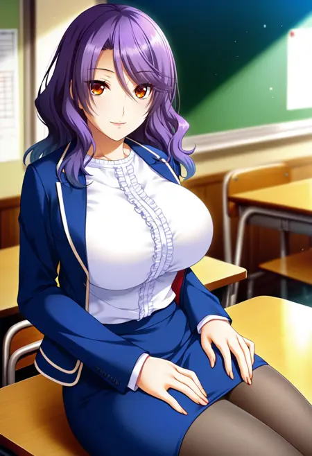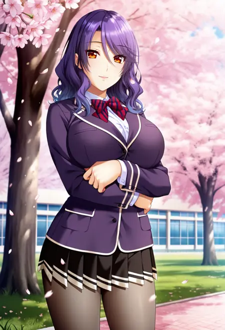 1 タイツ、制服、プリーツスカート、ブラックミニスカート、パープルのブレザー、白シャツ、ストライプのボウタイ