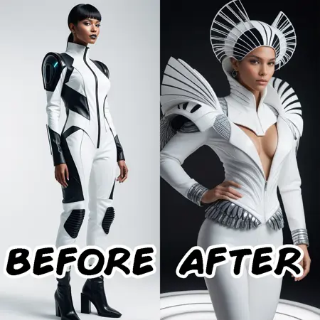 이 LoRA는 모델 전체의 패션을 더 앞서가는 방향으로 학습되었습니다. 실재적 및 반실재적 모델과 잘 어울립니다. 이는 하이 패션, 패션쇼의 개념을 이해하며, 기본적으로 옷에 그 extra bit of pzaz(더 많은 매력)를 더해줍니다.