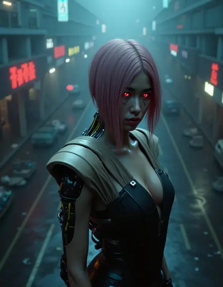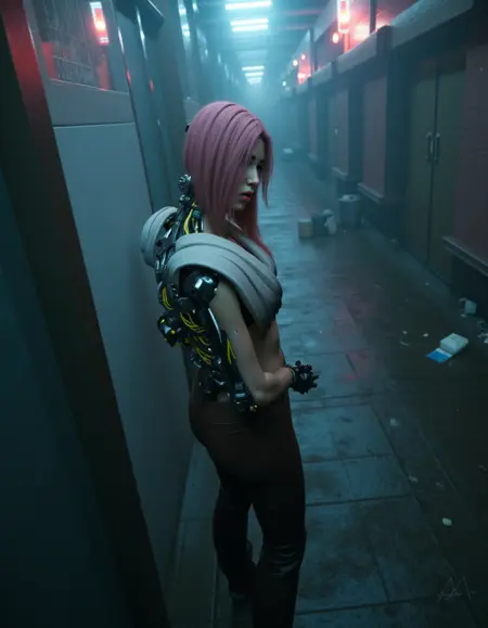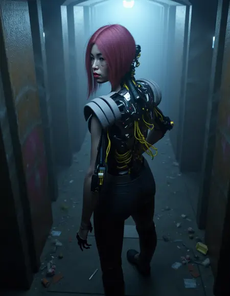 Prompts : magenta hair, song so mi, songbird, cyberware, cybernetic, korean woman, cyborg, short hair, realistic, mechanical parts, lips, android, mechanical arms, robot joints