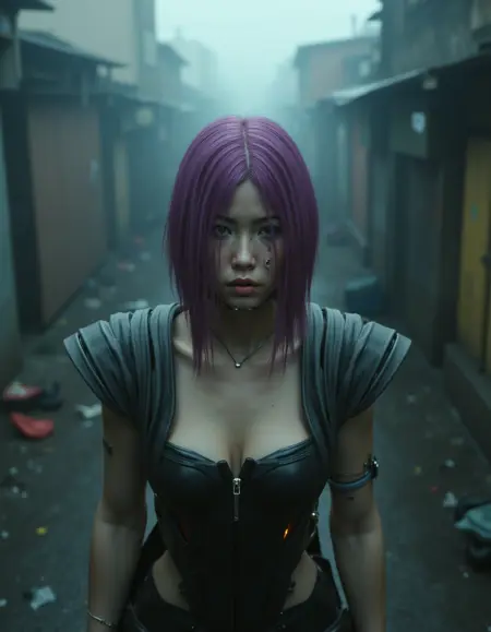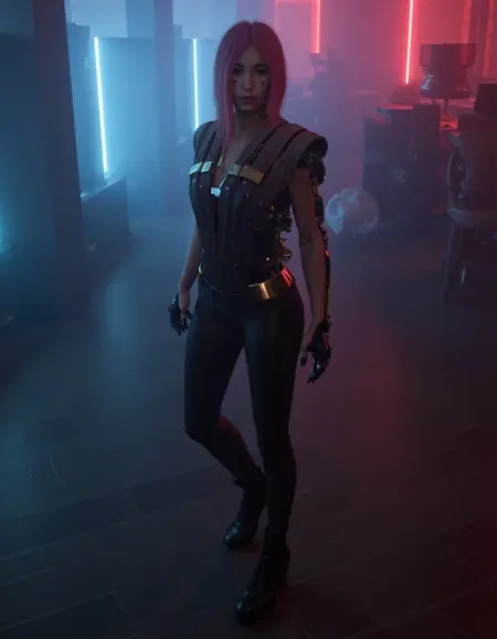 So Mi is a netrunner of Korean descent, with a height of approximately 5'4-5.[8] Her hair color varies on appearance, it's either magenta with orange highlights, or just magenta. She has brown eyes with red eye shadow. She can be seen wearing a unique EMP Threading cyberware pattern on her face.