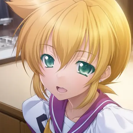 Shana Mikage, green eyes, short hair, blond hair, messy hair, ahoge