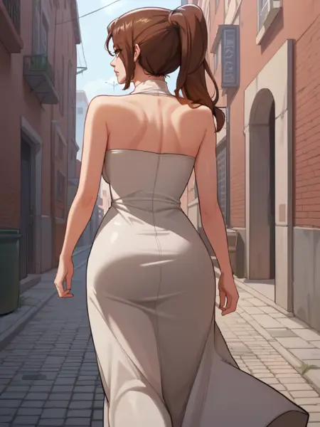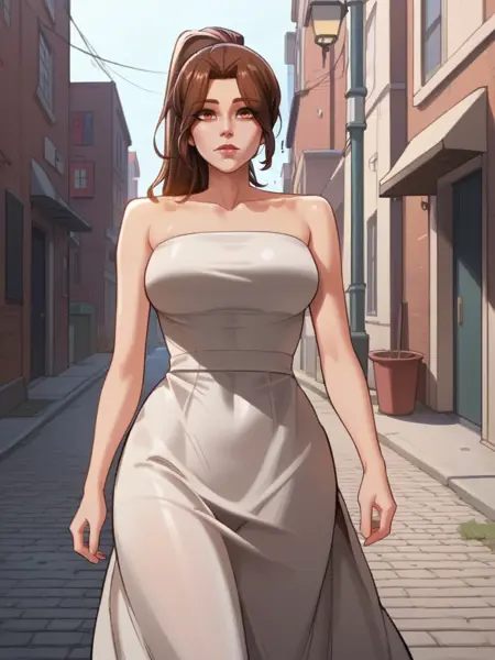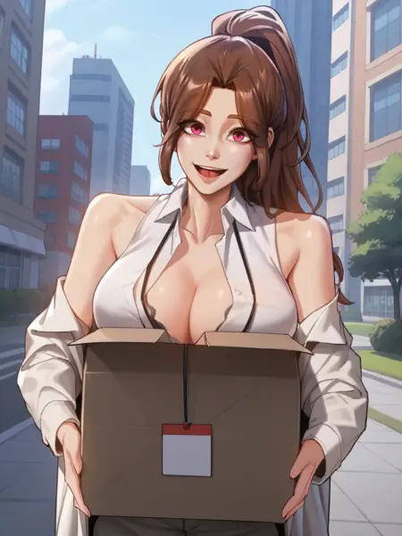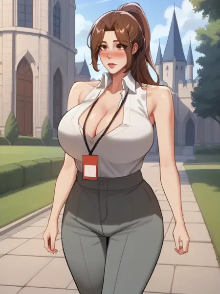 - RHyemi, 1girl, high ponytail, brown hair, brown eyes, cleavage, sleeveless shirt, grey pants, long hair, white shirt, id card, collared shirt, bare shoulders, lanyard, parted bangs, collarbone,