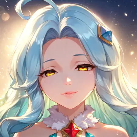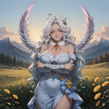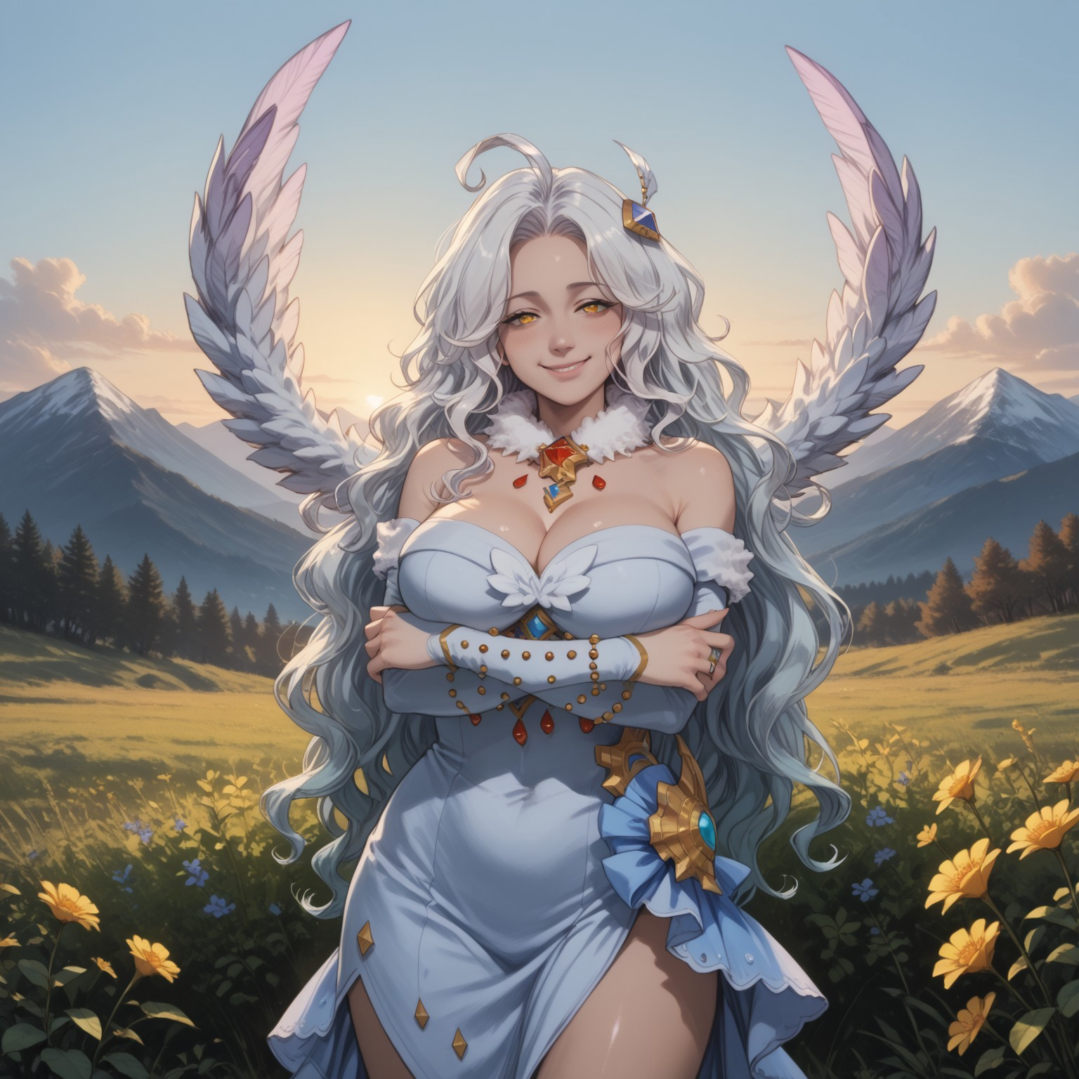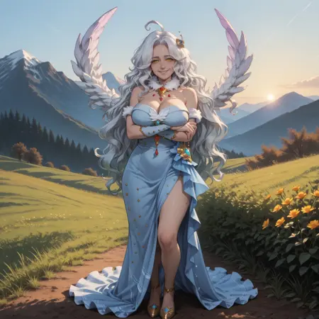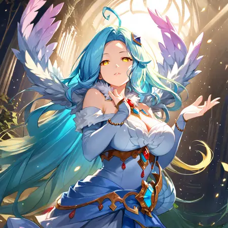 Trigger words: Lucretia, long hair, blue hair, white hair, blonde hair, gradient hair, wavy hair, yellow eyes, half-closed eyes, mole under mouth, ahoge, hair ornament, fur trim, wings, feathers, cleavage, large breasts, dress, bare shoulders, bridal gauntlets, jewelry, wide hips, thighlet, high heel boots,
