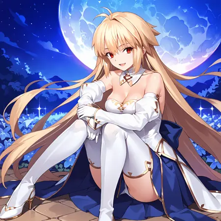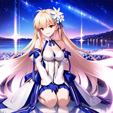 (arc_3:1.1), 金发, 红眼, 竖瞳, 胸部, 刘海, 长发, 极长发, 天线发, 发饰, 白色头发花朵, 部分发光的头发,