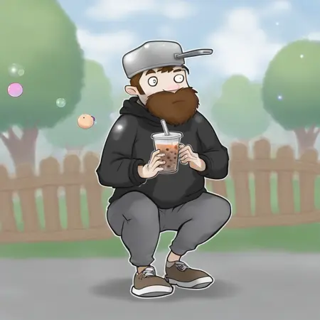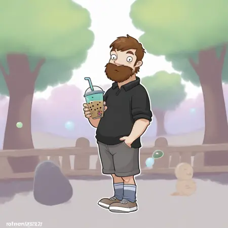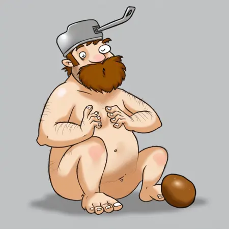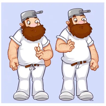 brown hair, brown beard, frying pan on head, 1boy, solo, white t-shirt, pant, fat