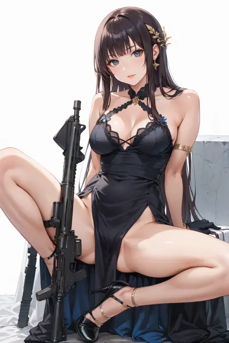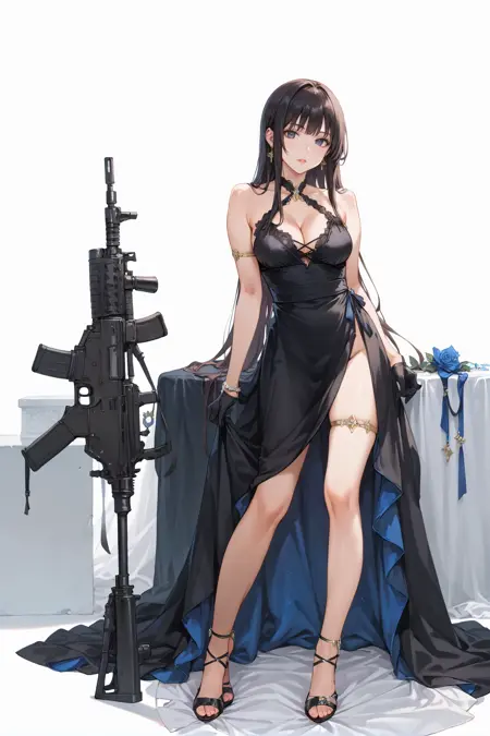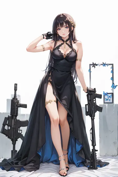 kk_sexydress_set44,1girl,black dress,solo,weapon,m4 carbine,gun,rifle,high heels,long hair,black gloves,black footwear,