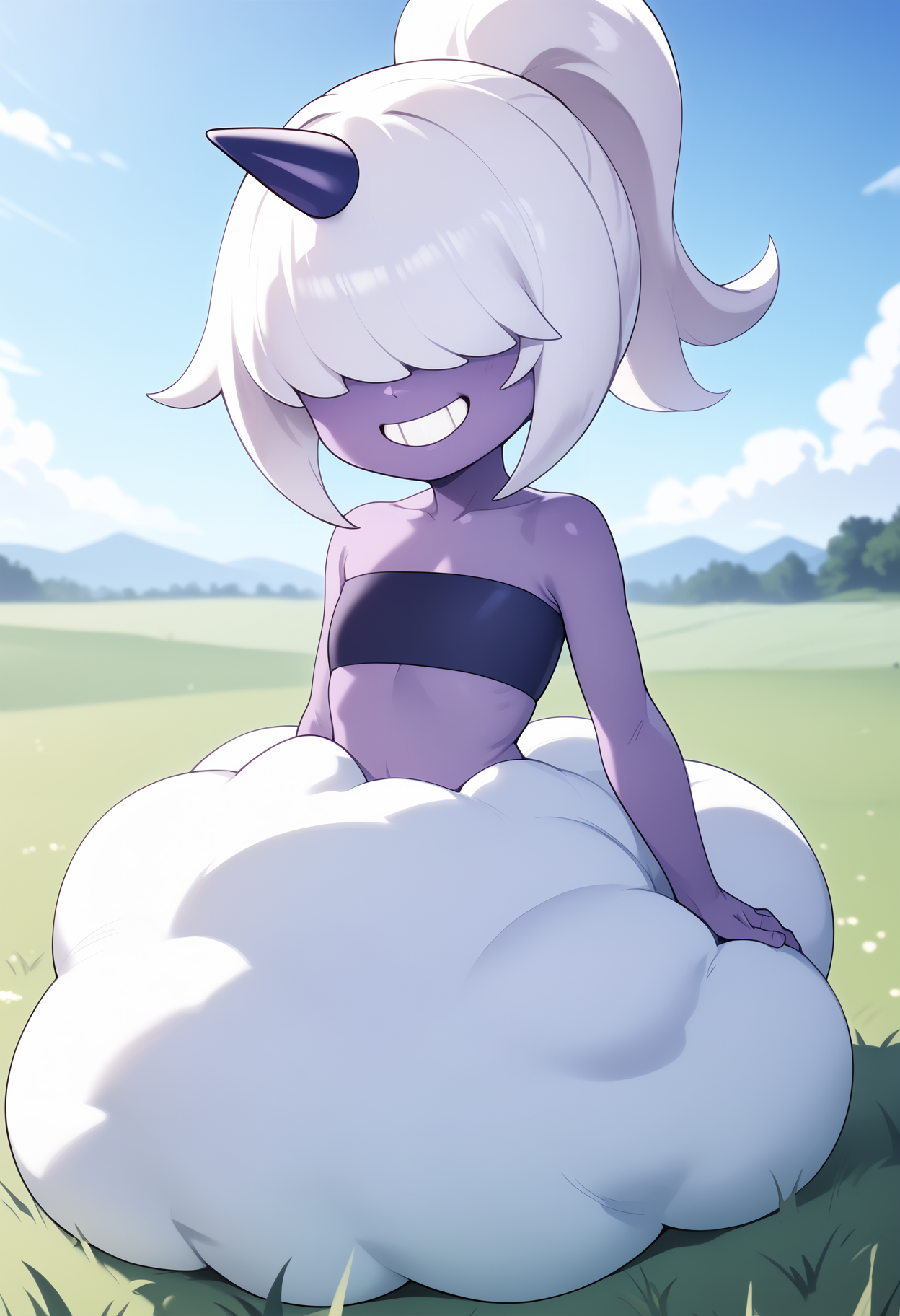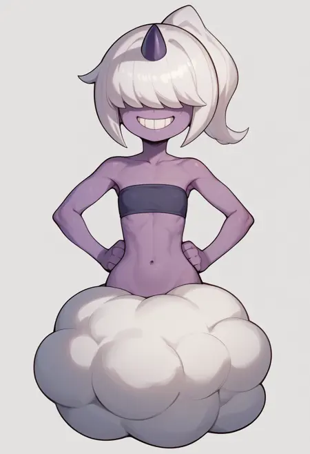 Basic prompts : 1girl, dazzi, white hair, ponytail, hair over eyes, single horn, purple skin, grin, teeth, cloud