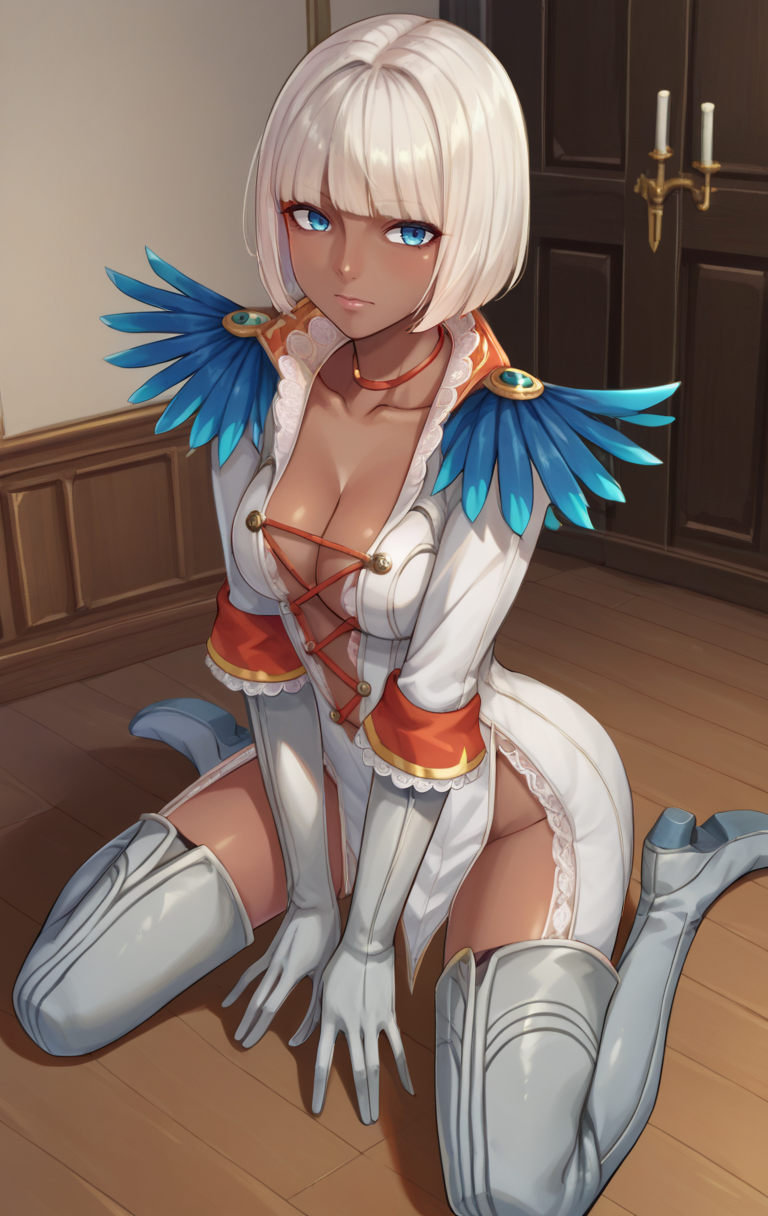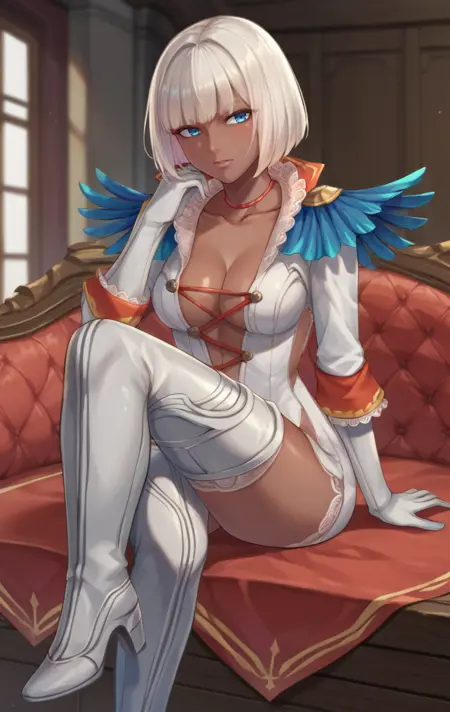 GloriaSDXL,1girl,bob cut,short hair,blue eyes,thighhighs,gloves,cleavage,white hair,boots,elbow gloves,dark skin,dark-skinned female,thigh boots,