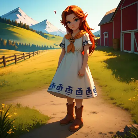 cmalon,red hair,long hair,parted bangs,blue eyes,pointy ears,orange neckerchief,brooch,dress,short sleeves,blue trim,brown boots