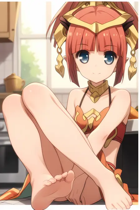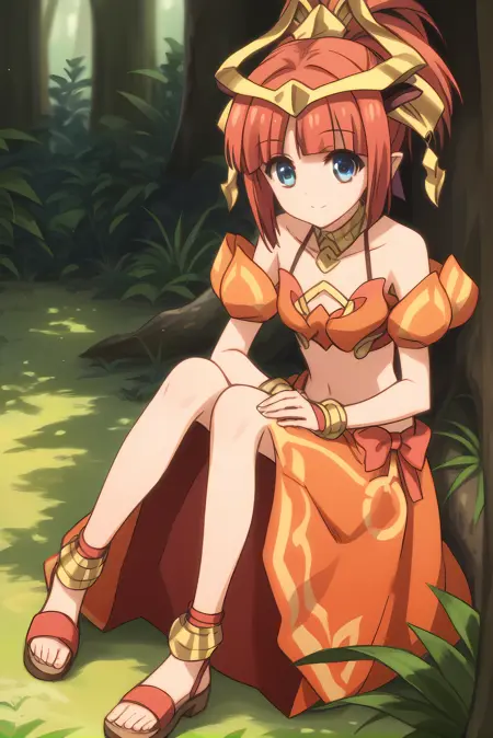 red hair, short hair, ponytail, blue eyes, pointy ears, horns