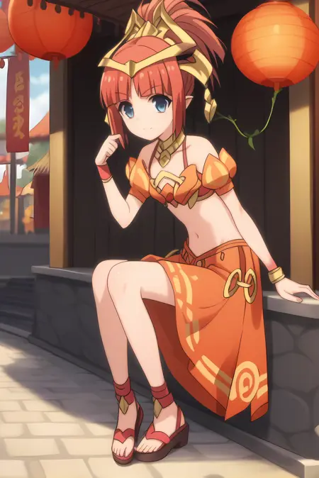 red dress, midriff, orange top, orange skirt, sandals