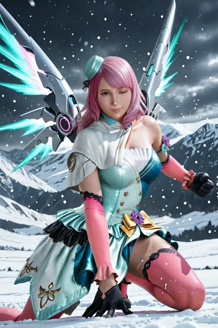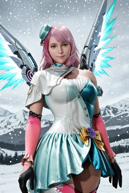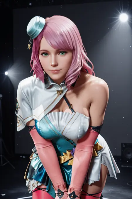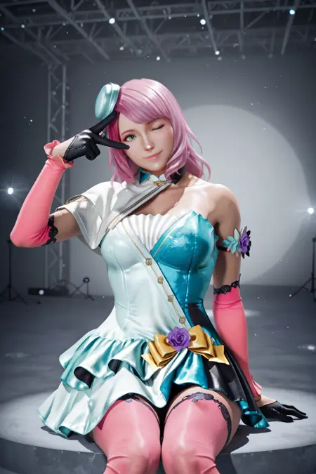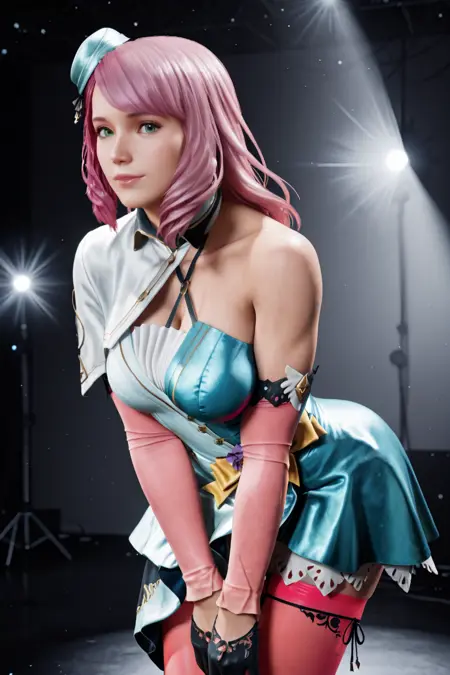 | 训练词汇 | Alisa Bosconovitch, long hair, pink hair, green eyes, yellow bow, elbow gloves, white dress, aqua dress, blue dress, short dress, purple flower, mini hat, two-tone dress, asymmetrical clothes, single bare shoulder, capelet, gloves, pink thighhighs, multicolored dress, high heels, black footwear已复制! |
