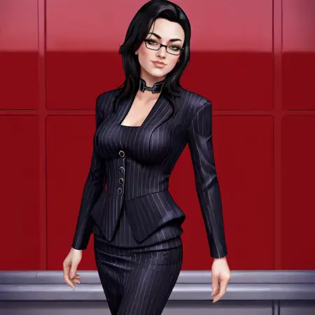 Trigger :MirandaMassEffect, 1girl, black hair, bodysuit, medium breasts, long hair, lips