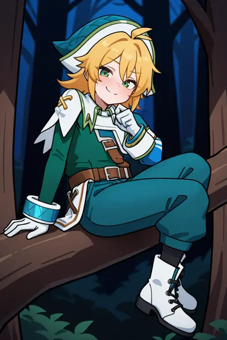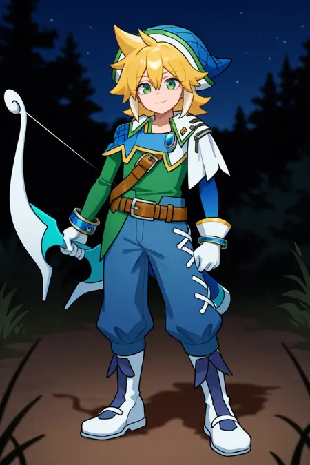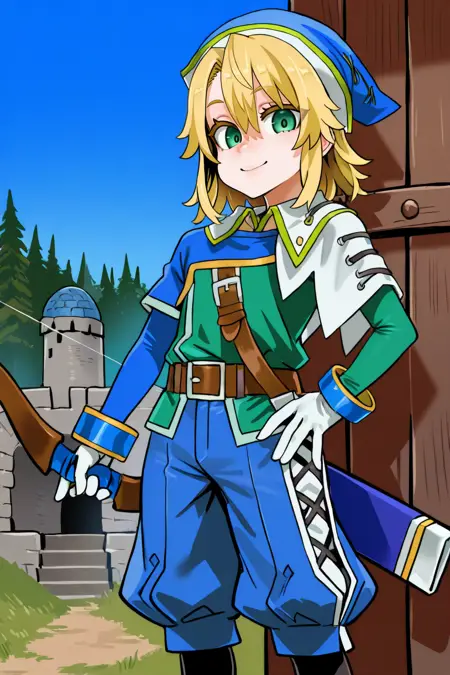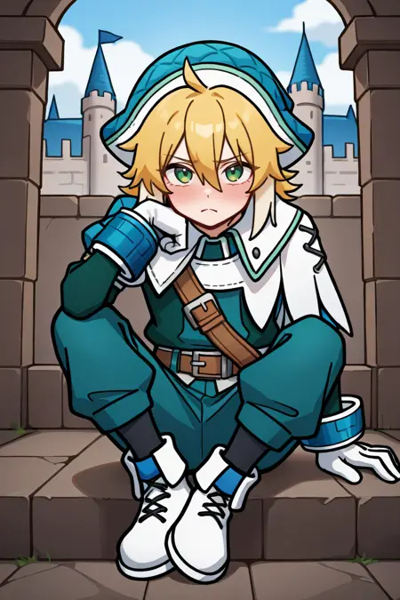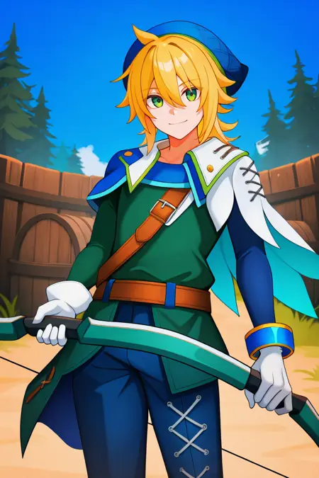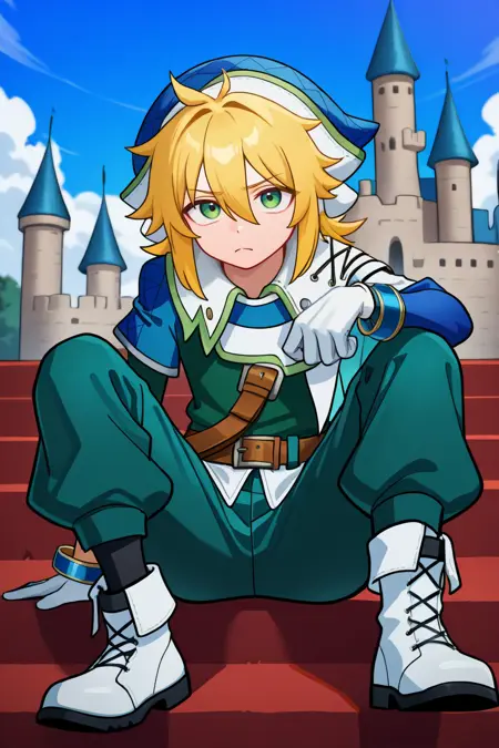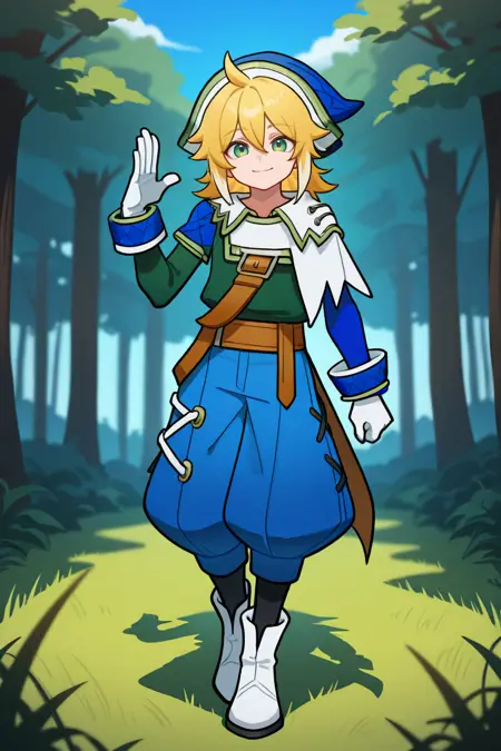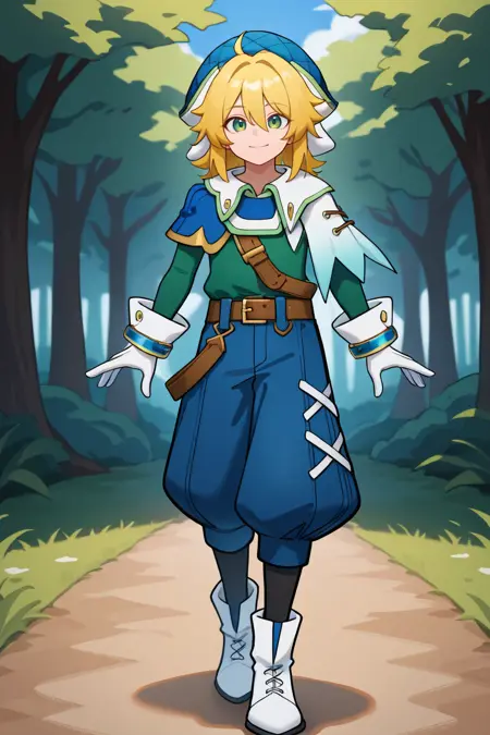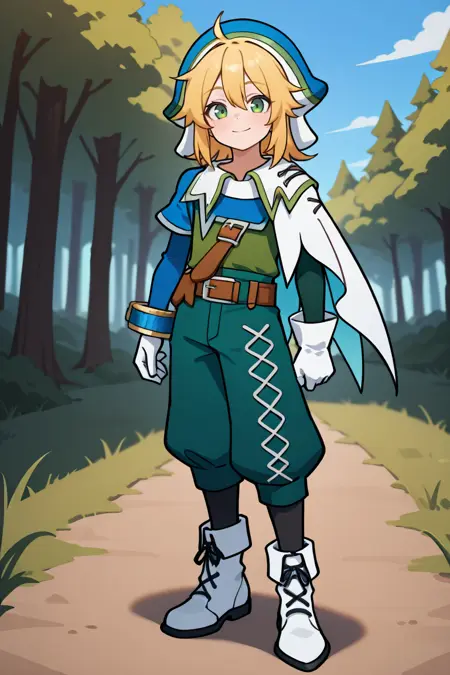 有益标签: 1boy, 绿眼睛, 金发, 中长发, 帽子, 蓝色头饰, 不对称服装, 交叉系带服装, 侧披风, 白色侧披风, 白色手套, 不匹配的袖子, 绿色袖子, 蓝色袖子, 蓝色手镯, 绿色衬衫, 宽松的蓝色裤子, 腰带, 肩带, 黑色袜子, 白色靴子,