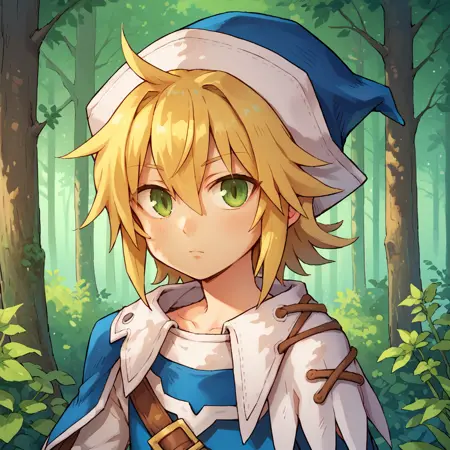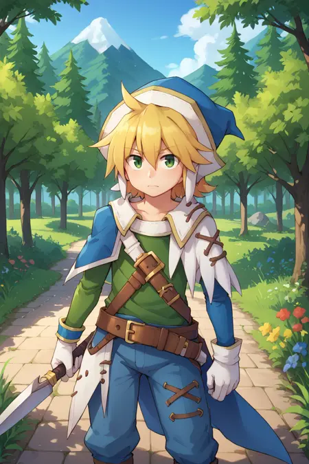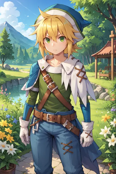 유용한 태그: 1boy, 녹색 눈, 금발, 중간 길이 머리, 뾰족한 머리, 모자, 파란색 머리 장식, 비대칭 옷, 십자 끈으로 묶인 옷, 사이드 케이프, 흰색 사이드 케이프, 파란색 사이드 케이프, 흰장갑, 맞지 않는 소매, 녹색 소매, 파란색 소매, 파란색 팔찌, 녹색 셔츠, 파란색 바지, 벨트, 어깨 벨트, 검은 양말, 흰부츠